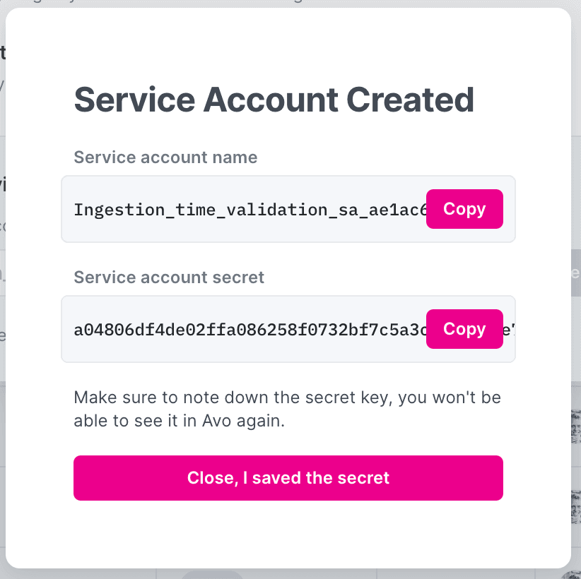 Once Avo has generated and securely stored your secret, you get one chance to view it. Copy the secret key and save it securely in your internal systems.