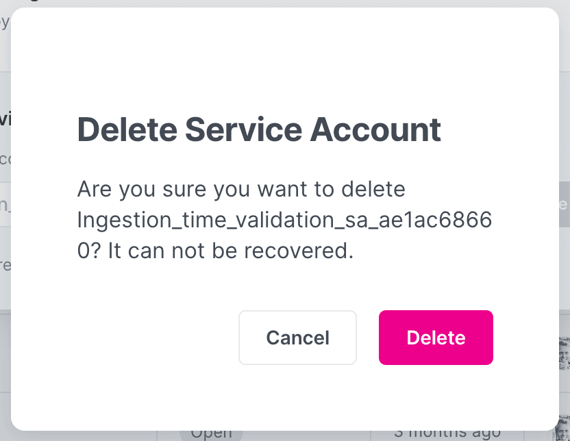 again in the confirm window that pops up.💡This action cannot be undone. Once deleted, there is no way to recover the service account again. As soon as a service account has been deleted it will stop working immediately.