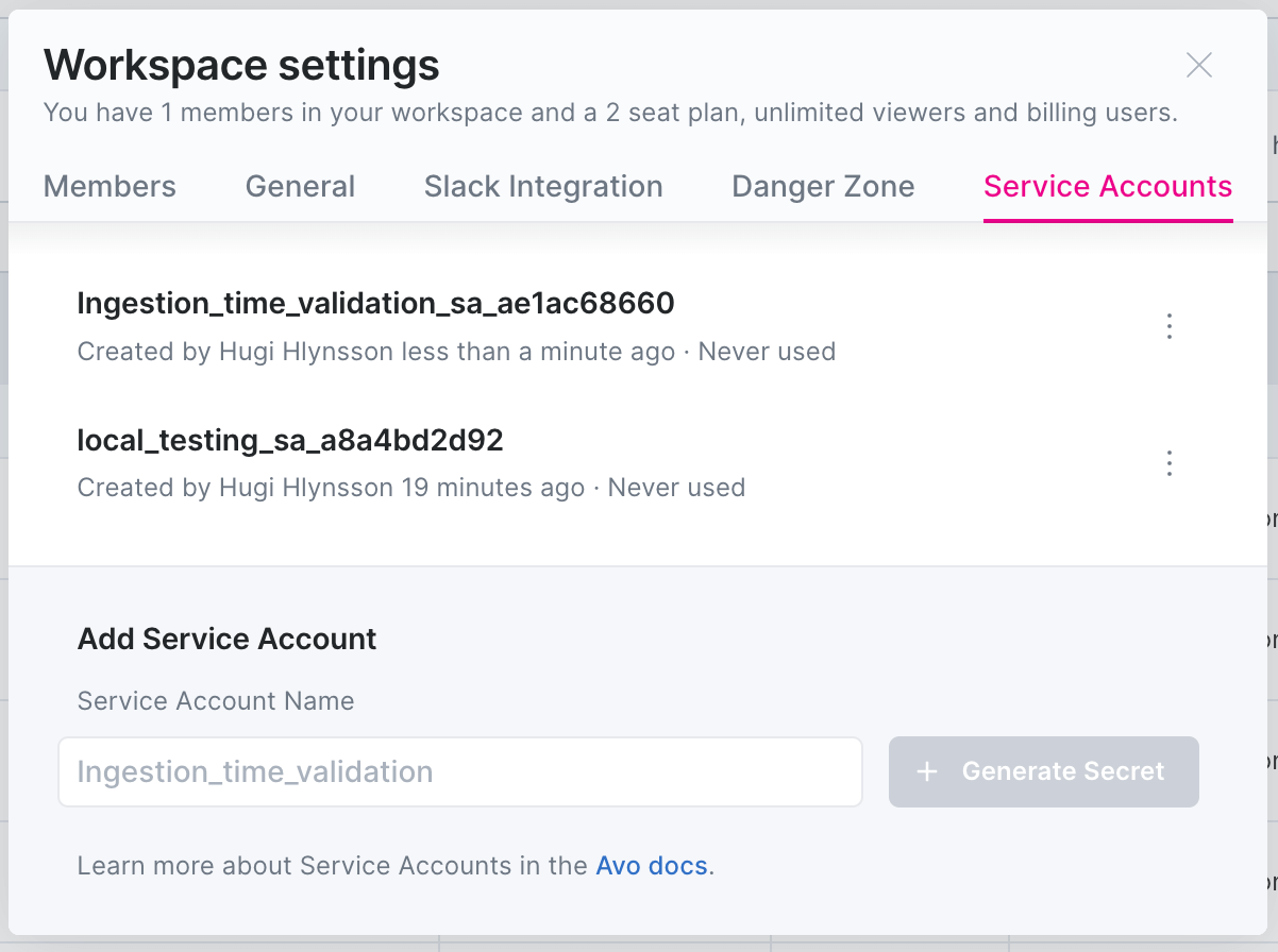 Navigate to your Service Account Workspace Settings (opens in a new tab) or open the settings cogwheel in the Avo sidebar, select